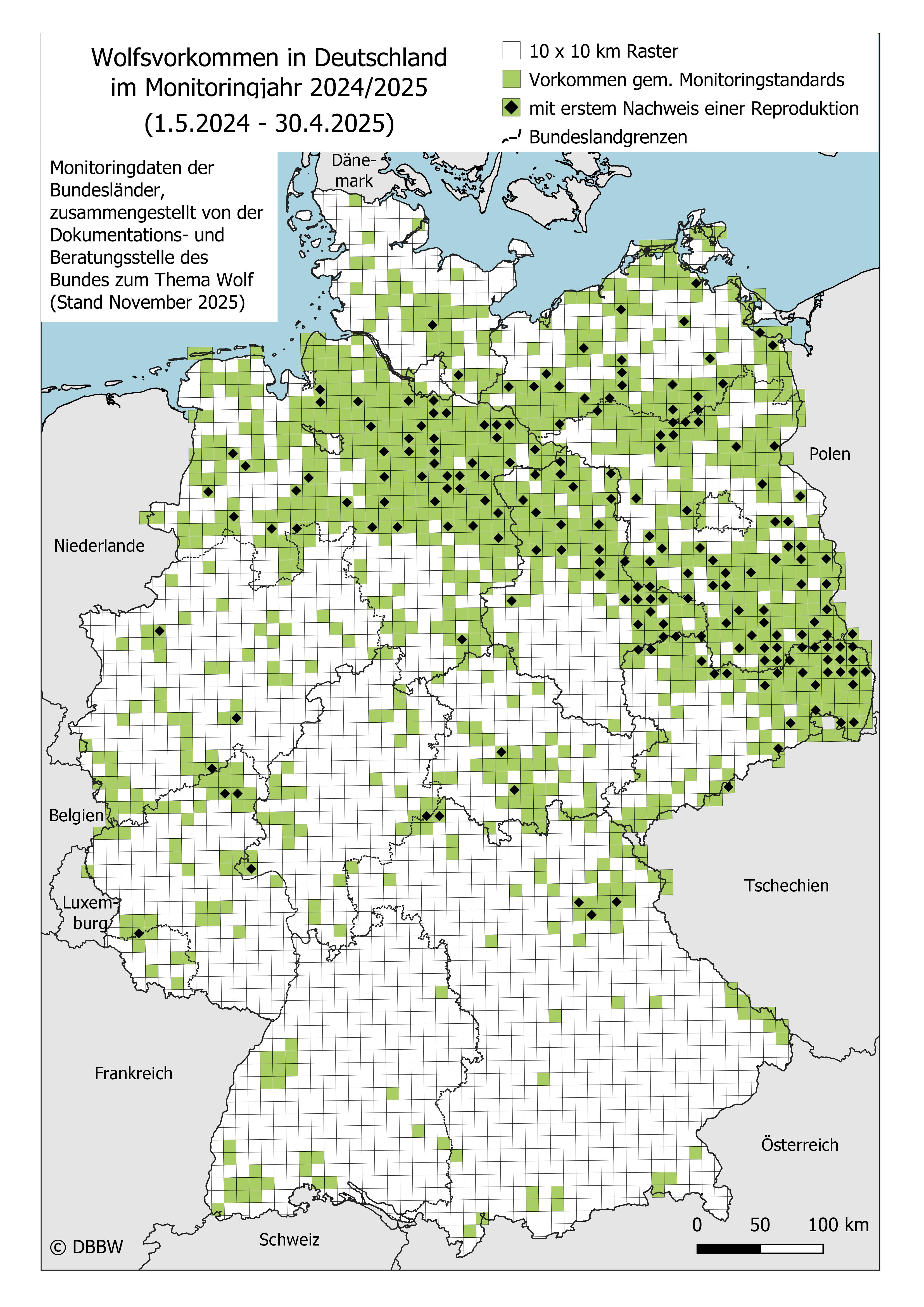 Eine 10x10 km Rasterzelle gilt für ein Monitoringjahr als besetzt (grün), wenn darin mindestens ein Wolfsnachweis oder drei voneinander unabhängige bestätigte Wolfshinweise liegen. Zellen, in denen für ein Rudel der jeweils erste Reproduktionsnachweis des jeweiligen Monitoringjahres erbracht wurde, sind mit einer Raute gekennzeichnet. Wenn Wolfsterritorien aneinander grenzen, können auch Reproduktionen von mehr als einem Rudel in einer Zelle liegen.